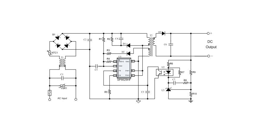SP6629HF在PWM模式下工作于固定頻率,這個頻率是由內(nèi)部精確設(shè)定的。在空載或者輕載時,工作頻率由IC內(nèi)部調(diào)整。芯片可以工作在綠色模式,以此來減小輕載時的損耗,提高整機的工作效率,SP6629HF在啟動和工作時只需要很小的電流,可以在啟動電路中使用一個很大的電阻,以此來進一步減小待機時的功耗。芯片內(nèi)置有斜坡補償電路,當電路工作于大占空比時,避免次諧波振蕩的發(fā)生,改善系統(tǒng)的穩(wěn)定性。內(nèi)置有前沿消隱時(Leading-edge blanking time),消除緩沖網(wǎng)絡(luò)中的二極管反向恢復(fù)電流對電路的影響。SP6629HF采用了抖頻技術(shù),能夠有效改善系統(tǒng)的EMI性能。系統(tǒng)的跳頻頻率設(shè)置在音頻(20KHz)以上,在工作時可以避免系統(tǒng)產(chǎn)生噪音。SP6629HF內(nèi)置多種保護,包括逐周期限流保護(OCP),過載保護(OLP),過壓保護(OVP),VDD過壓箝位,欠壓保護(UVLO),過溫保護(OTP)等,通過內(nèi)部的圖騰柱驅(qū)動結(jié)構(gòu)可以更好的改善系統(tǒng)的EMI特性和開關(guān)的軟啟動控制。SP6629HF使用SOP7無鉛封裝。