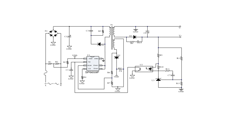 SP6659P是一顆高性能、多工作模式的PWM控制芯片。芯片可以工作在跳頻及綠色模式,以此來減小空載和輕載時的損耗,也可以工作在QR工作模式及CCM工作模式,提高整機的工作效率。SP6659P在啟動和工作時只需要很小的電流,可以在啟動電路中使用一個很大的電阻,以此來進(jìn)一步減小待機時的功耗。SP6659P內(nèi)置多種保護(hù),包括:輸入電壓過低保護(hù)(Brown-out),輸出電壓短路保護(hù),VDD過壓保護(hù)(OVP),VDD過壓箝位,VDD欠壓保護(hù)(UVLO),過溫保護(hù)(OTP)等。