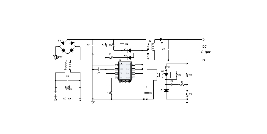 SP6639HF是一顆電流模式PWM控制芯片,內(nèi)置功率MOSFET,用于功率在27W以內(nèi)的方案。該芯片在系統(tǒng)輸出空載時(shí)工作在跳頻模式,在系統(tǒng)輸出輕載到中等負(fù)載階段工作在PFM模式,在輸出重載時(shí)工作在最大恒定工作頻率。SP6639HF的啟動(dòng)電流和工作電流設(shè)定的比較小,以此減小待機(jī)時(shí)的功耗。芯片內(nèi)置有斜坡補(bǔ)償電路,避免次諧波振蕩的發(fā)生,改善系統(tǒng)的穩(wěn)定性。芯片內(nèi)置有前沿消隱時(shí)間(Leading-edge blanking time),消除緩沖網(wǎng)絡(luò)中的二極管反向恢復(fù)電流對(duì)電路的影響。該芯片帶有抖頻功能,能夠有效改善系統(tǒng)的EMI性能。芯片最低的工作頻率設(shè)置在音頻以上,在工作時(shí)可以避免系統(tǒng)產(chǎn)生噪音。SP6639HF內(nèi)置多種保護(hù),包括逐周期限流保護(hù)(OCP),過壓保護(hù)(OVP),VDD過壓箝位,欠壓保護(hù)(UVLO),過溫保護(hù)(OTP)等,通過內(nèi)部的圖騰柱驅(qū)動(dòng)結(jié)構(gòu)可以更好的改善系統(tǒng)的EMI特性和開關(guān)的軟啟動(dòng)控制。