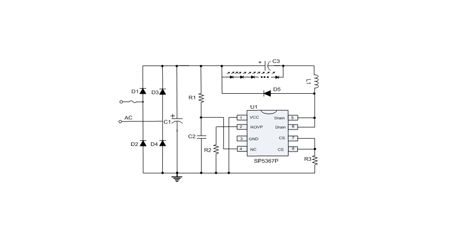 SP5367P具有多種保護功能,包括輸出短路/開路保護、芯片供電欠壓保護、CS電阻短路保護及過熱調節等。