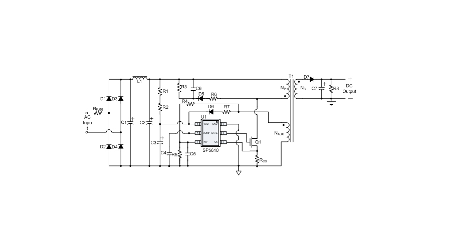 SP5610提供上電軟啟動功能與各種可自恢復的保護功能,包括逐周期限流保護(OCP),VDD過壓保護(OVP),VDD過壓箝位,欠壓保護(UVLO),過溫保護等。SP5610具有的抖頻功能,可以提供更好的EMI性能。