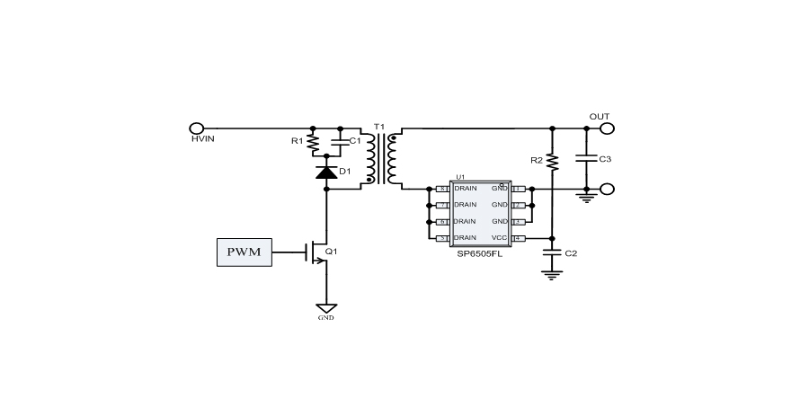SP6505FL檢測內(nèi)置MOSFET的導通電阻(Rds-on)上的壓降,來控制MOSFET的開關。應用外圍簡單。適用于5V輸出的應用方案。