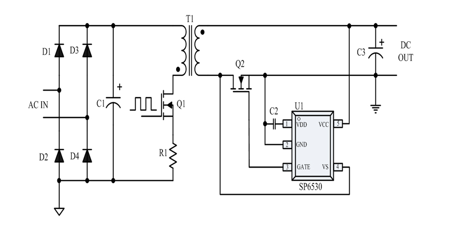 SP6530是一顆高性能的開關電源次級側同步整流控制電路。在低壓大電流開關電源應用中,輕松滿足6級能效,是理想的超低導通壓降整流器件的解決方案。芯片可支持高達150KHz的開關頻率應用,并且支持CCM / QR / DCM等開關電源工作模式應用,其極低導通壓降產生的損耗遠小于肖特基二極管的導通損耗,極大提高了系統的轉換效率,大幅降低了整流器件的溫度。高達1A的峰值電流驅動能力可確保快速開通和關斷外部的大電流MOSFET器件,獲得優異的轉換效能,輸出電壓鉗位功能使得高供電電壓下柵極仍然安全可靠。