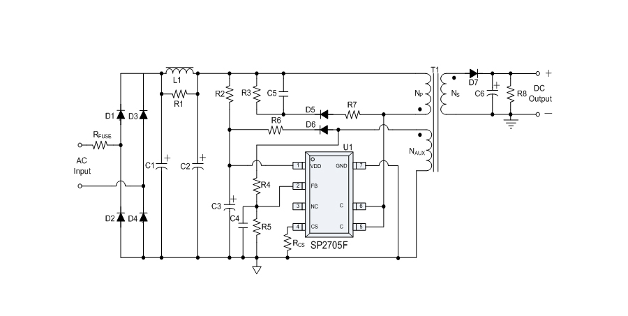 SP2705F非常適合低成本應用方案,內置環路補償,無需外置補償電容;采用原邊反饋控制,無需光耦和TL431。