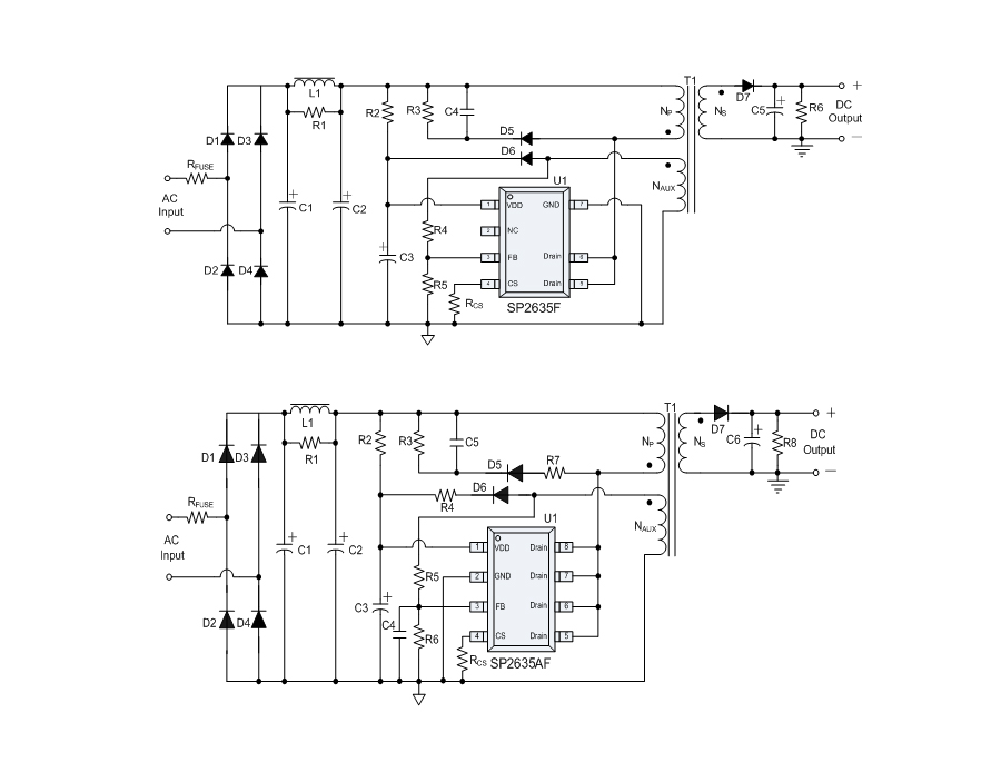 SP2635F是一款性能優異的原邊反饋控制電路,應用于小功率AC/DC充電器與適配器。控制電路使用原邊采樣技術進行精確的恒流、恒壓控制,可以省去一般應用中的光耦與TL431。