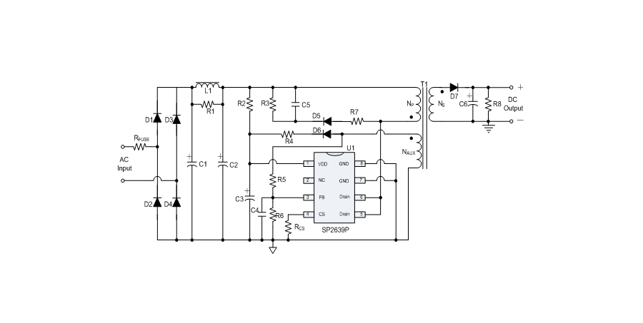 SP2639P是一款性能優異的原邊反饋控制電路,應用于小功率AC/DC充電器與適配器。控制電路使用原邊采樣技術進行精確的恒流、恒壓控制,可以省去一般應用中的光耦與TL431。