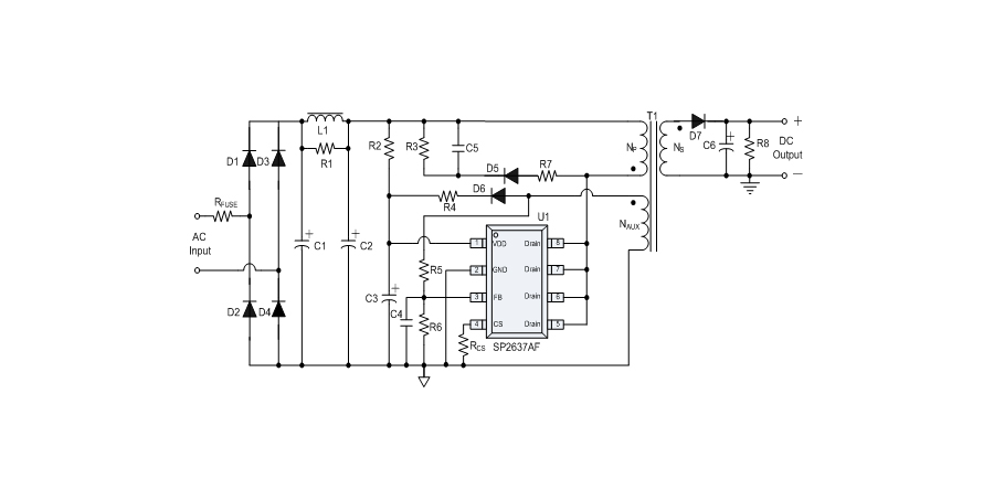 SP2637AF是一款性能優異的原邊反饋控制電路,應用于小功率AC/DC充電器與適配器。控制電路使用原邊采樣技術進行精確的恒流、恒壓控制,可以省去一般應用中的光耦與TL431。