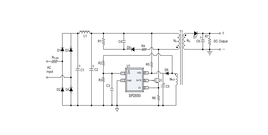 SP2650是一款性能優異的原邊反饋控制電路,應用于小功率AC/DC充電器與適配器。控制電路使用原邊采樣技術進行精確的恒流、恒壓控制,可以省去一般應用中的光耦與TL431。